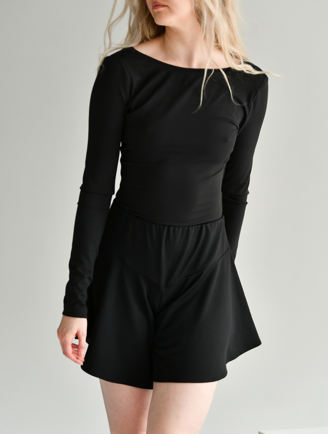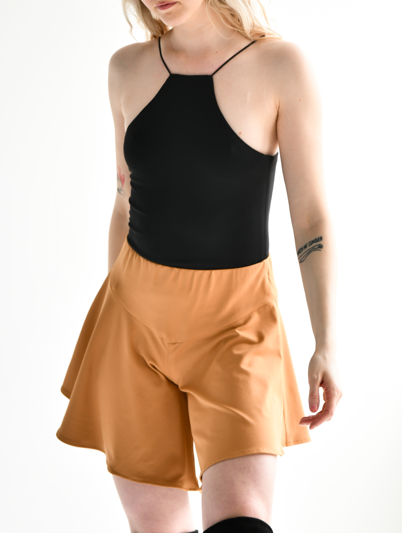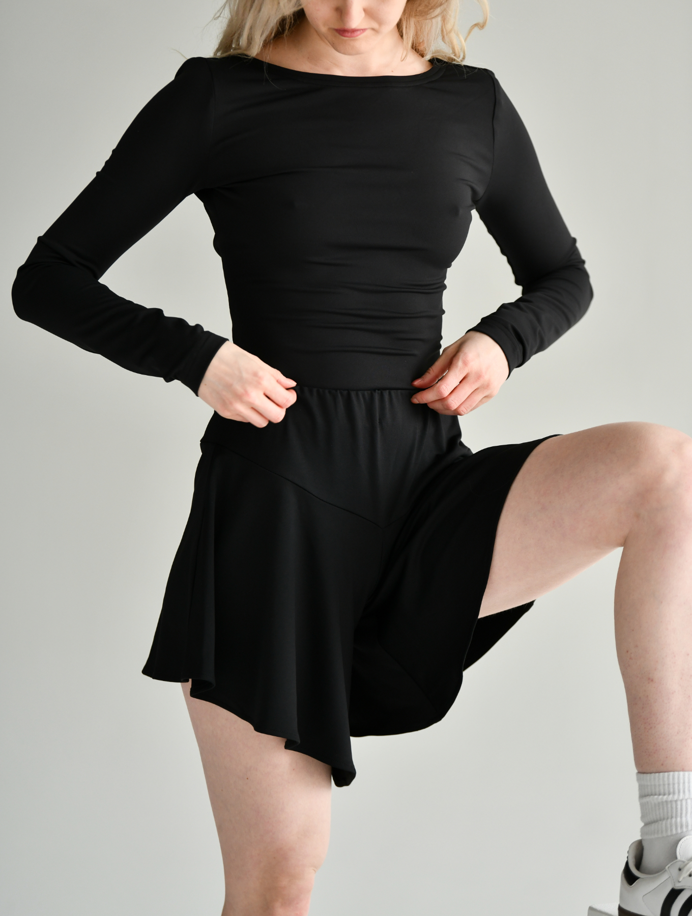 Ove šorts pantalone sa karnerima donose jedinstvenu kombinaciju ženstvenosti i modernog dizajna. Visoki struk naglašava figuru, dok dramatični volani dodaju dinamičnost svakom pokretu.